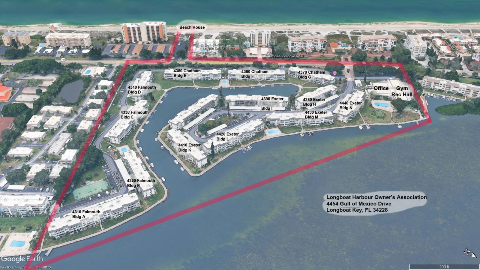 Longboat Harbour is a 300 unit condominium complex located on Longboat Key, an eleven mile long island a few miles off the Florida Gulf coast near Sarasota. We have berths for over 50 boats on the sheltered Sarasota Bay side of the island and enjoy our beach house with restrooms, showers, and parking across Gulf of Mexico Drive on the Gulf side of the island. Other amenities include four swimming pools, a tennis court, a gym, wood shop, art studio, banquet hall, and more.